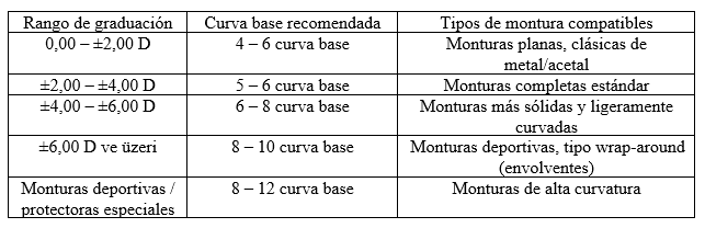 - En graduaciones altas (>6 D), se requieren curvas base más altas para evitar distorsiones ópticas y lograr una mejor armonía estética.